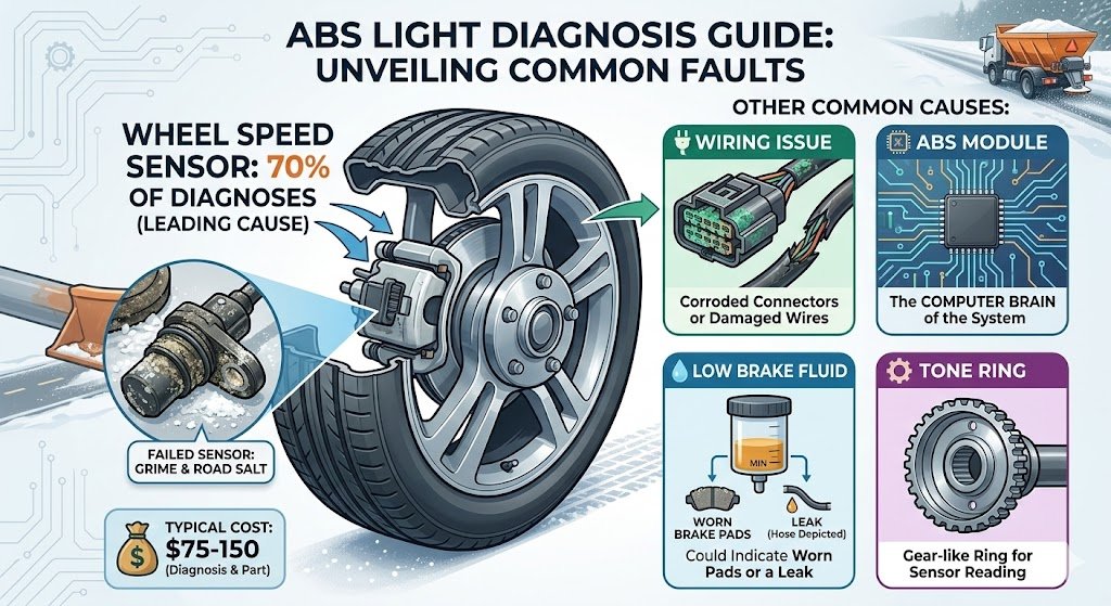 About 70% of ABS lights I diagnose come down to a faulty wheel speed sensor. These little sensors get covered in road grime and salt — especially after our Burnt Hills winters.