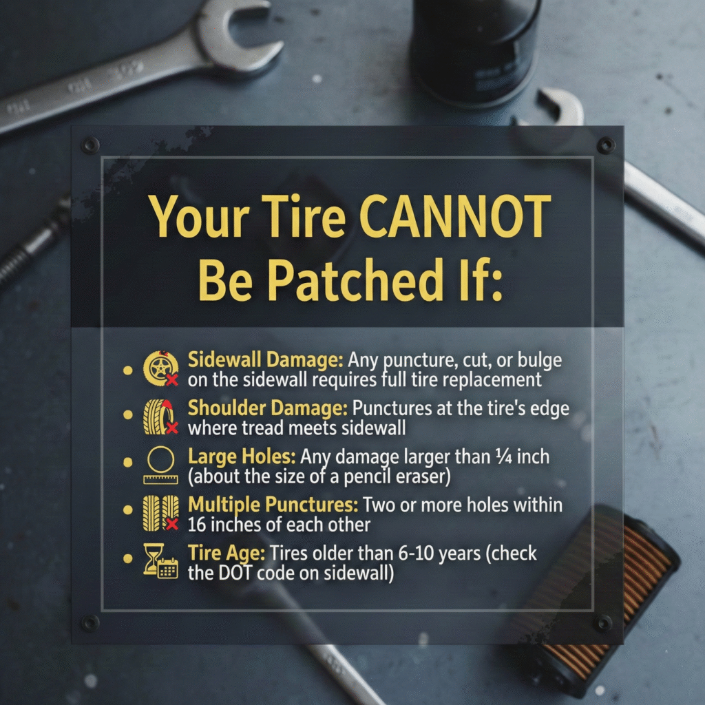 Even a properly repaired tire has limits. Do NOT drive on a patched tire if: