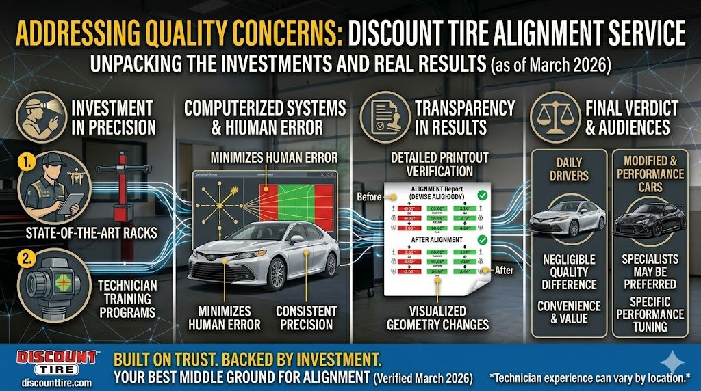 For most daily drivers, the quality difference between Discount Tire and a dedicated alignment shop will be negligible. Those with modified suspensions or performance setups may still prefer a specialist.