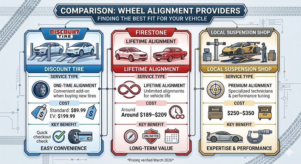 If you plan to keep your car long-term, Firestone’s lifetime alignment option (typically priced around $189–$209) may offer better value since it provides unlimited alignments for the life of the vehicle. But for drivers seeking a one-time, convenient alignment after a tire purchase, Discount Tire’s $89.99 service is a highly cost-effective choice.