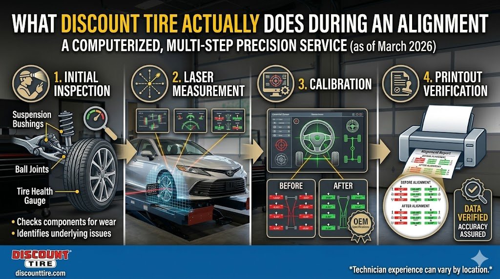 Discount Tire uses computerized laser alignment systems to measure and adjust your vehicle’s suspension geometry. The process includes: