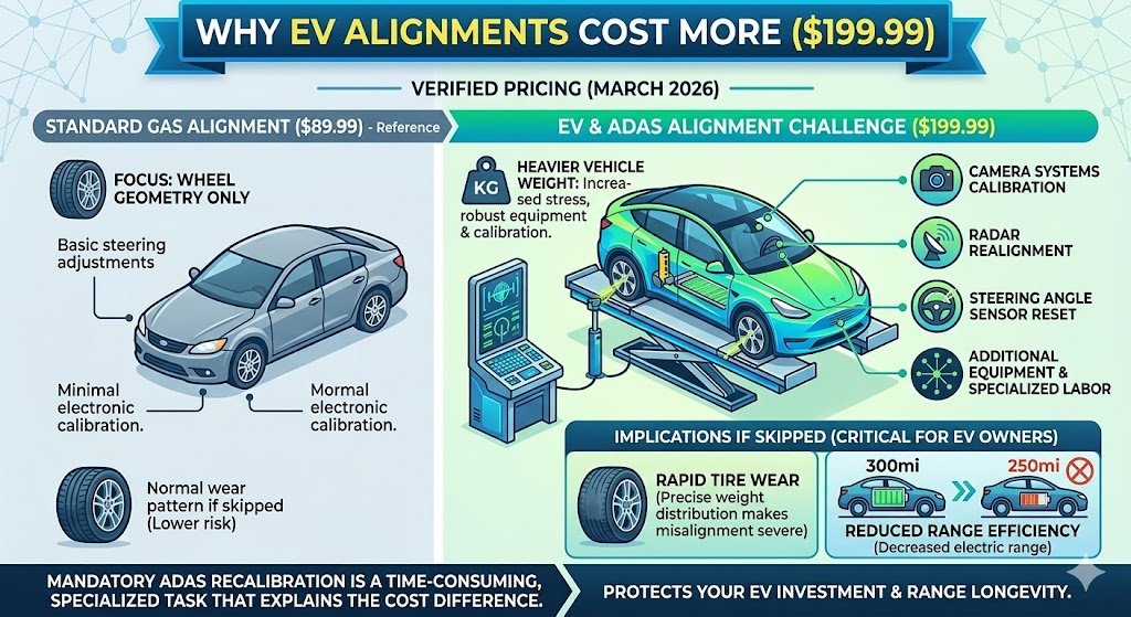 Electric vehicles are heavier than gas-powered cars and often feature complex ADAS systems. When an EV’s suspension geometry is altered, technicians must also recalibrate steering angle sensors, cameras, and radar systems. This additional labor and specialized equipment explain the $199.99 price tag.