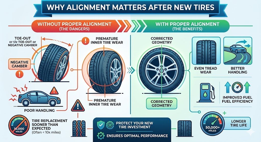Even brand-new cars can leave the factory with slightly aggressive toe or camber settings that cause premature inner tire wear. For drivers investing in new tires, a proper alignment ensures:
