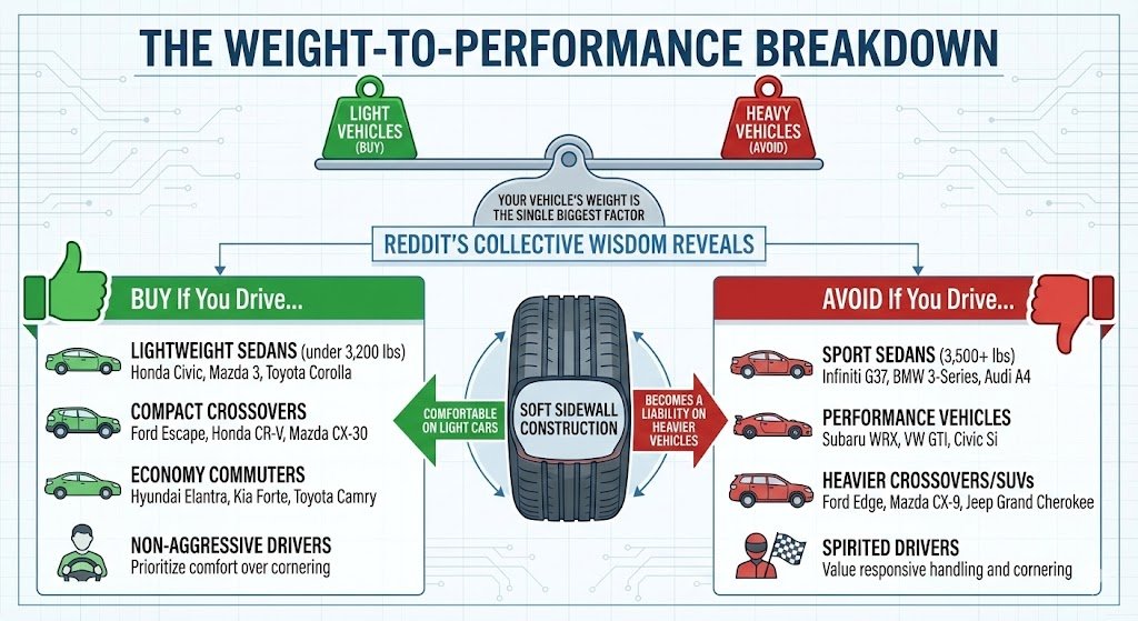 Here’s what Reddit’s collective wisdom reveals: your vehicle’s weight is the single biggest factor in whether these tires will work for you. The soft sidewall construction that makes them comfortable on light cars becomes a liability on heavier vehicles.