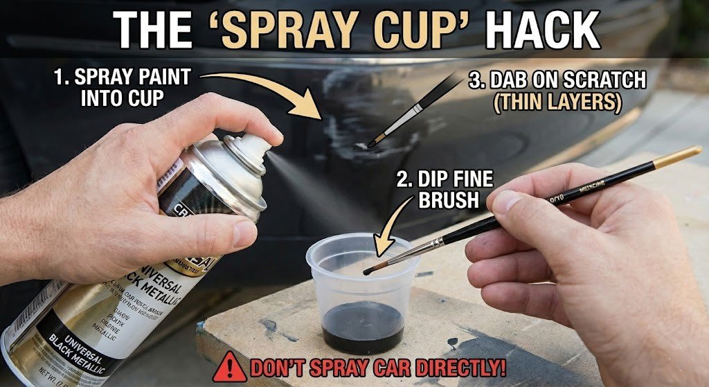 The Technique: Use a fine-tip artist brush (size 0/10) to dab the paint from the cup into the scratch. Build it up in thin layers rather than one big glob.