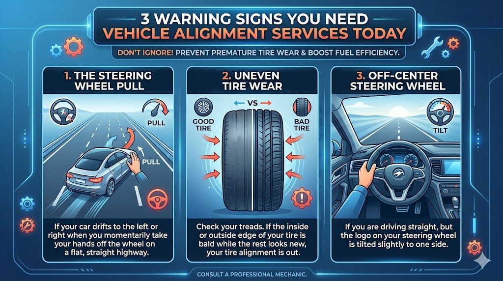Ignoring your car wheel alignment doesn’t just make driving uncomfortable—it wears down your expensive tires prematurely and decreases fuel efficiency. Look out for these three signs: