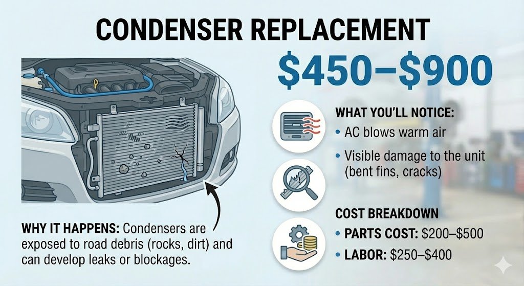 Why it happens: Condensers are exposed to road debris and can develop leaks or blockages.