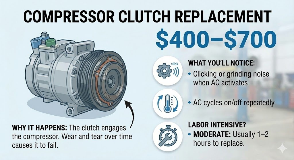 Why it happens: The clutch is what engages the compressor when you turn on the AC. Wear and tear causes it to fail.