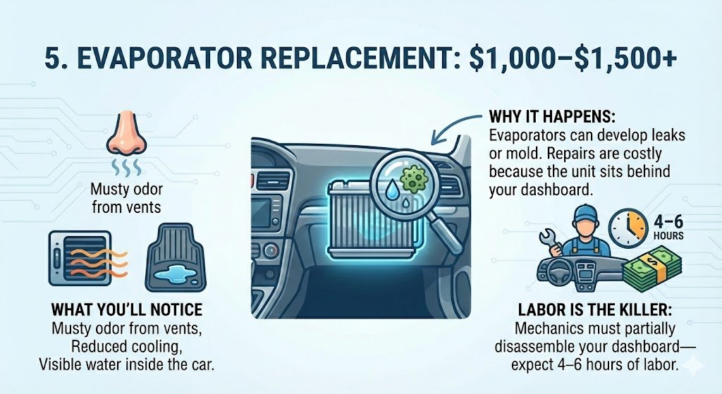 Why it happens: Evaporators can develop leaks or mold. Repairs are costly because the unit sits behind your dashboard.