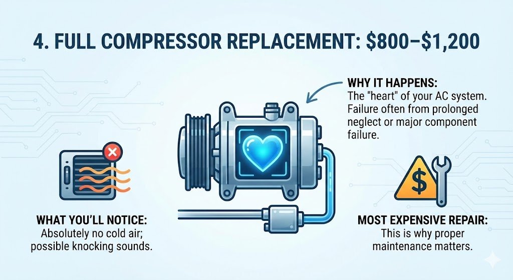Why it happens: The compressor is the “heart” of your AC system. Failure is often the result of prolonged neglect or major component failure.