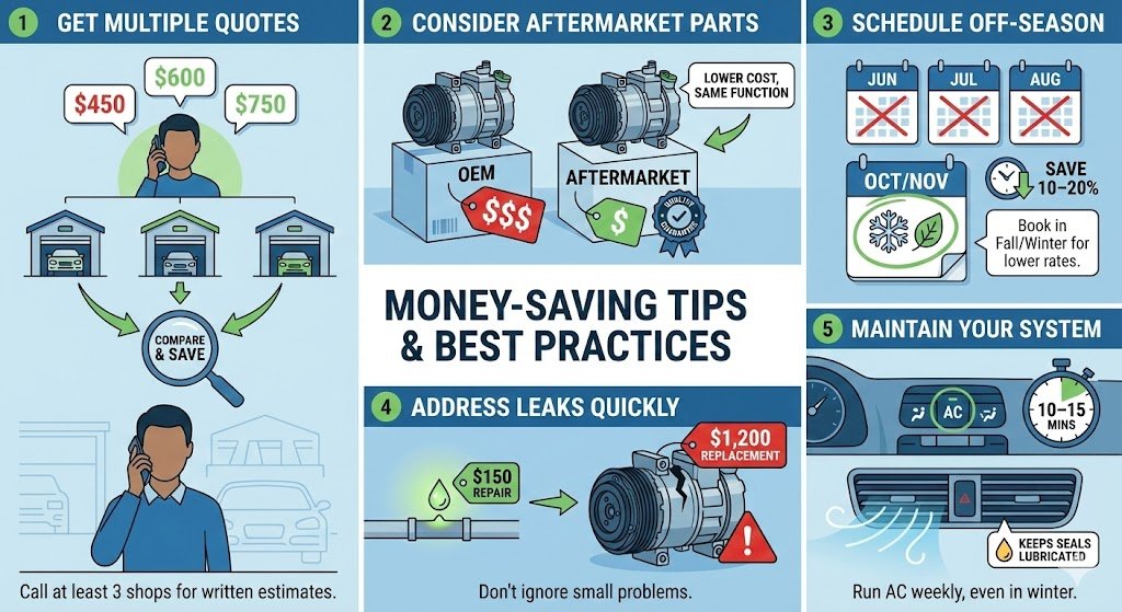 AC shops are slammed in the summer months. If your AC breaks in June, you’ll pay peak prices. Booking in fall or winter can save you 10–20%.