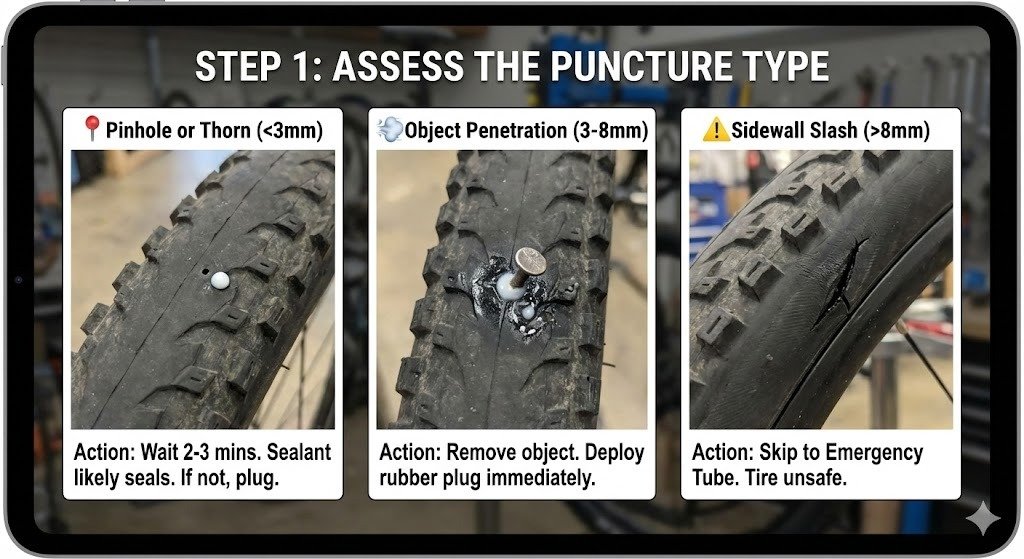 Not all punctures are created equal. Your repair approach depends entirely on the type and location of damage. Take 30 seconds to properly diagnose the problem before selecting your repair method.