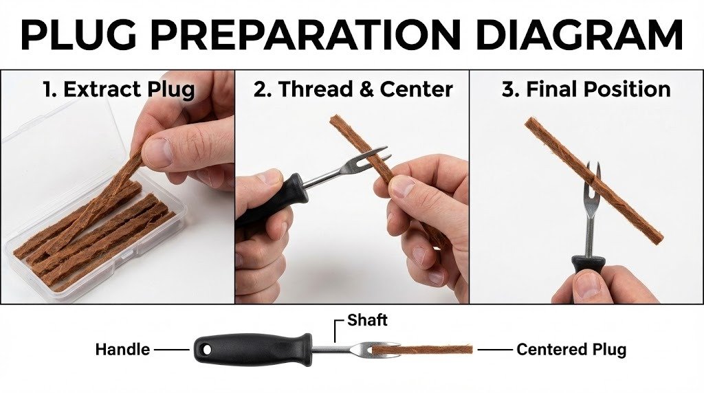 Extract one rubber plug strip from your kit. Thread it through the eye of the insertion tool, centering it so approximately equal lengths protrude from both sides. The plug should be seated firmly in the tool’s fork but not over-tightened.