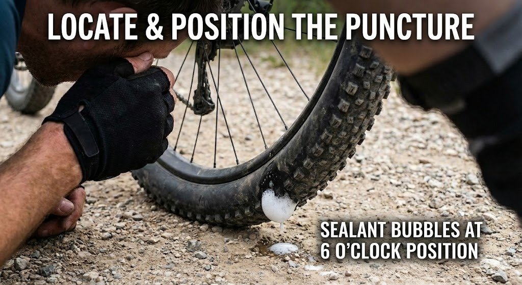 Spin the wheel slowly while looking for sealant bubbles or listening carefully for the hissing sound. Once located, rotate the wheel so the puncture sits at the bottom of the tire (the 6 o’clock position). This positioning is critical because it allows sealant to pool around the hole and provides the best angle for plug insertion.