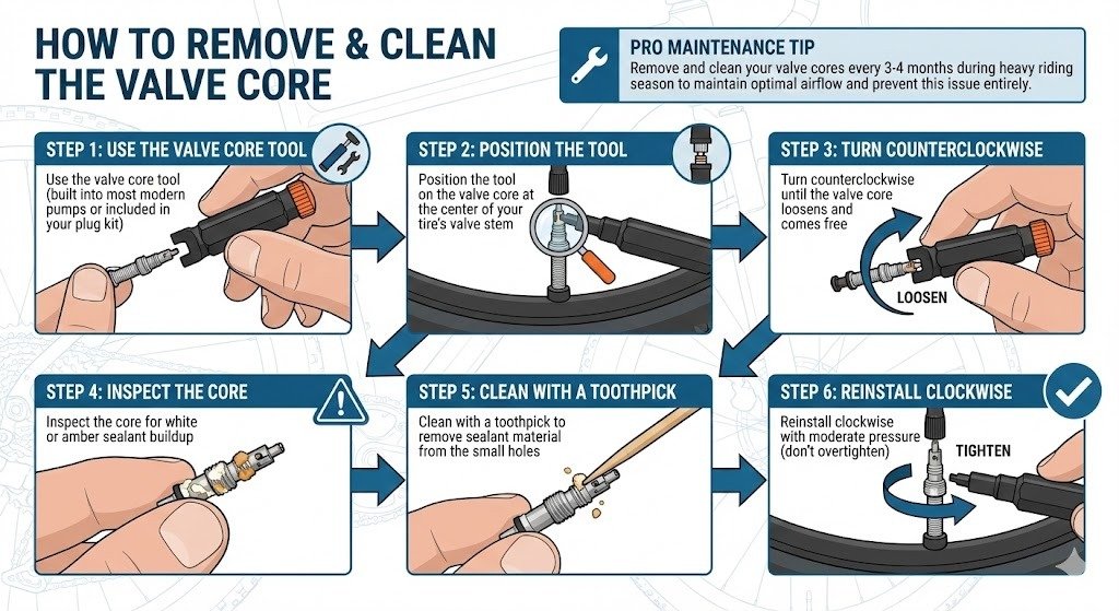 Pro Maintenance Tip: Remove and clean your valve cores every 3-4 months during heavy riding season to maintain optimal airflow and prevent this issue entirely.