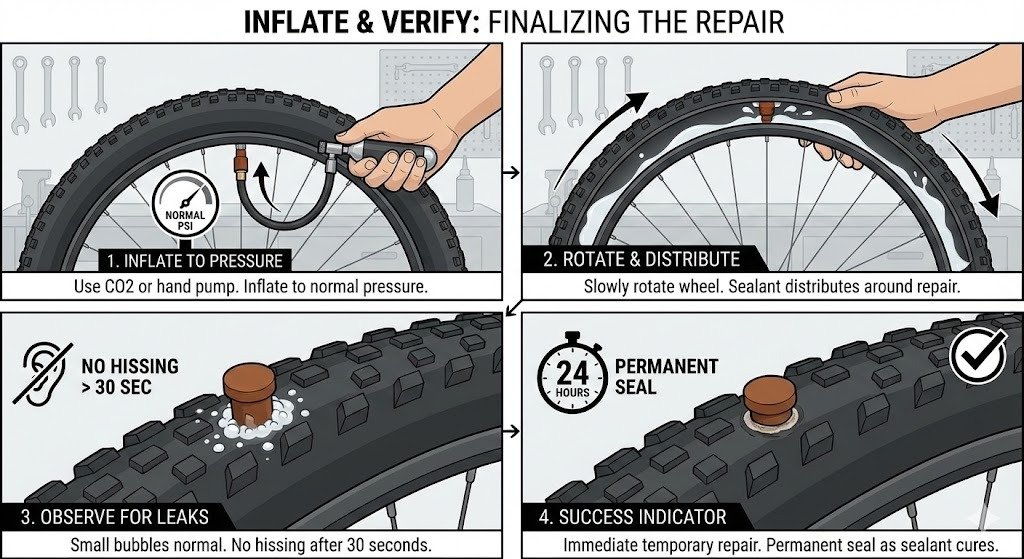 Inflate the tire to your normal pressure using CO2 or hand pump. Slowly rotate the wheel to allow sealant to distribute around the repair area. Observe for any continuing air loss. A small amount of sealant bubbling around the plug area is normal and indicates the system is sealing properly. You should not hear any hissing after 30 seconds of inflation.
