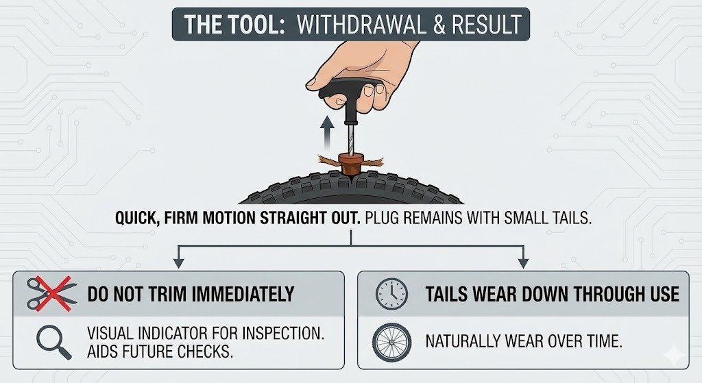 Withdraw the tool with a quick, firm motion straight out from the tire. The rubber plug remains inside the puncture hole, with small tails extending outward. Do not trim these tails immediately—they serve as a visual indicator of the repair location and aid in future inspection. The tails will naturally wear down through use.