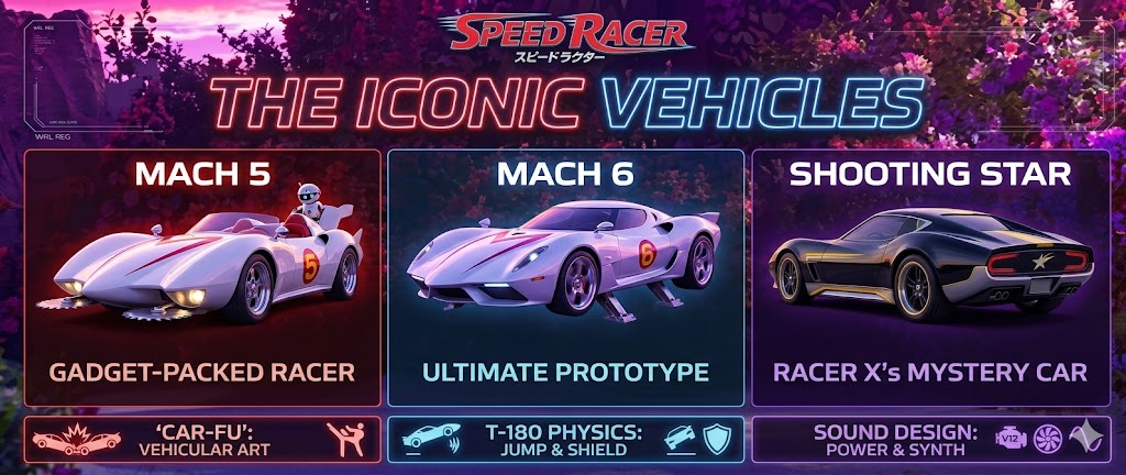 Let’s talk about why this movie belongs on a car site. The Wachowskis didn’t just design race cars — they designed an entire physics system for a fictional motorsport. The T-180 class vehicles are closed-cockpit, independently-wheeled machines with jump jacks, deflector shields, and weaponized chassis components. Every car in the WRL has a unique mechanical personality.
