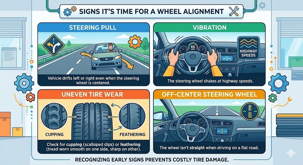 Recognizing early signs of misalignment can prevent costly tire damage. Common indicators include: