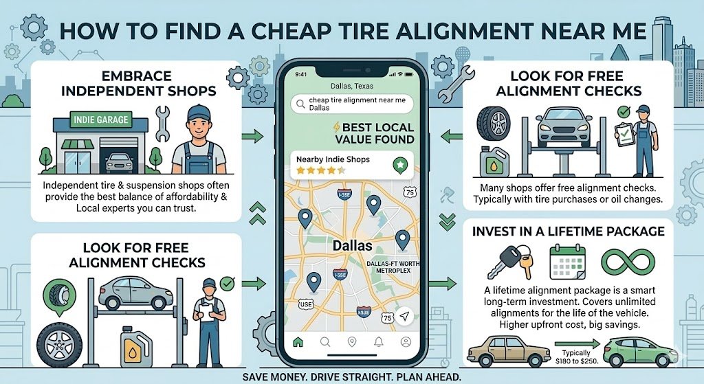 Searching for a “cheap tire alignment near me” doesn’t mean settling for poor service. Independent tire and suspension shops often provide the best balance of affordability and expertise. Many also offer free alignment checks with tire purchases or oil changes.