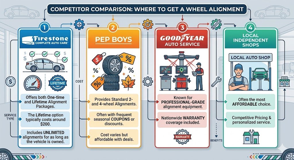 - Goodyear Auto Service: Known for professional-grade alignment equipment and nationwide warranty coverage.